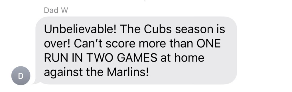 He’s not much of a texter, but at some point in the 20 years since I left Chicago to pursue job opportunities in journalism, Dad started the tradition of firing off a “Cubbies woo!” after every Cubs victory. I remember getting those messages on my very first cell, the standard 5-pound Nokia brick that everyone had back in the early aughts.