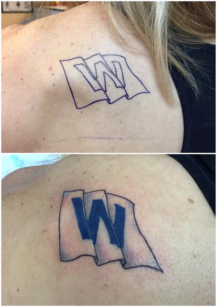 The last time I did this, four years ago, I white-knuckle-death-gripped my husband’s hand for 45 minutes straight as Sue, my tattoo artist, branded my shoulder with a simple, monochromatic ‘W’ flag in honor of the Cubs’ historic World Series victory. I think I branded Hubby in the process.
