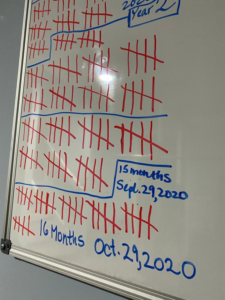 I mean, bright side: I can sit here today and say I filled up an entire whiteboard with hash marks, which might seem like a booby prize some days — a “trick,” rather than a “treat,” if you will 🎃 — but it’s important to remember what those little red lines represent.
