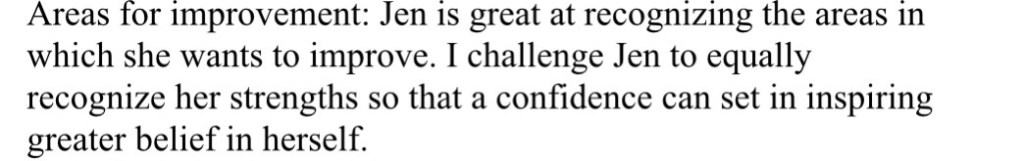 I cooled down a little when my Theories professor — who is basically my idol — marked 4’s in three of the eight possible categories (one was “Written Expression”…go figure! 🤷🏼‍♀️) And at the bottom of the evaluation sheet, where it asks for strengths and weaknesses, she wrote one of the least-critical criticisms I’ve ever seen: