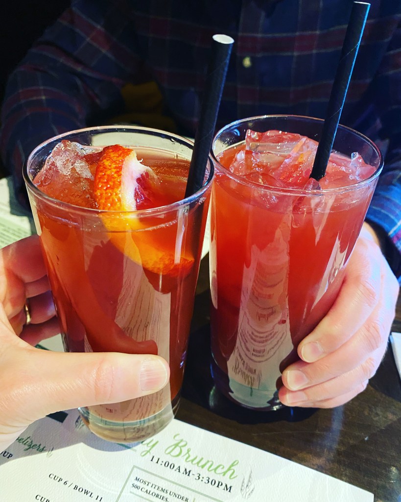 Well, I guess technically, all I really did was agree to go out for brunch, instead of insisting we stay in and order Door Dash like we usually do. At 2 1/2 years sober, going to restaurants still makes me a little nervous, even when we purposely choose a place with an interesting mocktail selection to balance out the giant menu book filled with booze. But, to honor my hubby, I made the (unnecessary) reservation, and put on real pants and shoes, and even straightened my hair. 😳