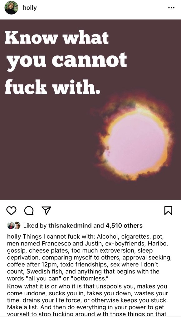 Make no mistake: When it comes to alcohol, that is and always will be an “abstinence project” for me. Personal choice; not saying it’s right for everyone. There are some things we know we just can’t fuck with — as recovery author/podcaster Holly Whitaker brilliantly puts it — and booze is 100% Number 1 on my list.