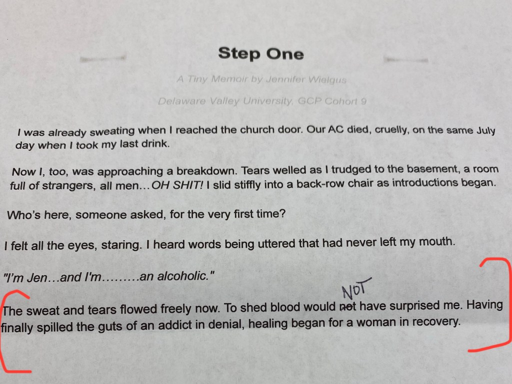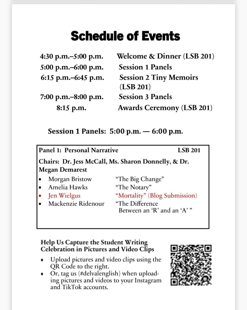 Safe to say I was totally in my element Tuesday night at Delaware Valley University’s annual Student Writing Conference, where I went to read one of my early-2022 blog posts, plus a short snippet of an even older piece that I struggled to slice and dice into a 100-word “Tiny Memoir.” (I only made it down to 126; shit, it’s tough being your own editor! 😫)