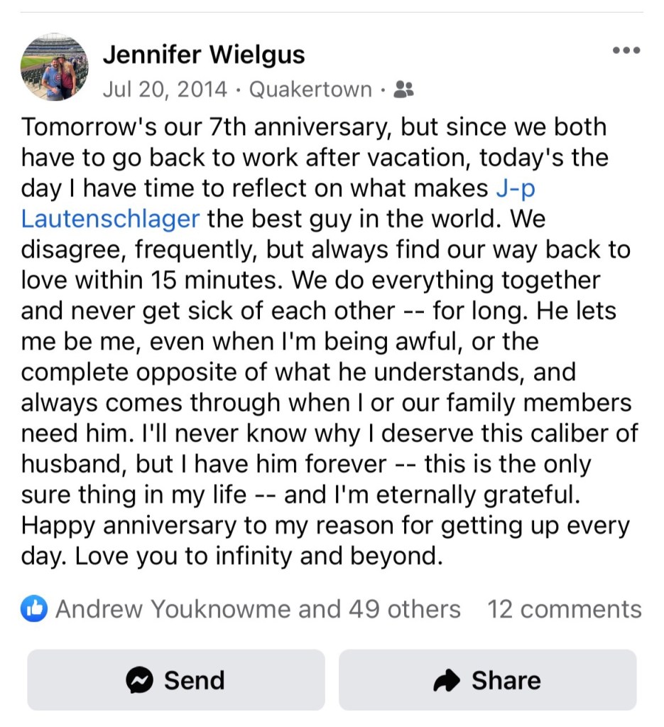 I couldn’t recite them verbatim, if you put me on the spot today, and our wedding video exists on a DVD we no longer have the equipment to play. But thinking back to the evening of July 21, 2007, when we stood in a modest-sized Chicago banquet room exchanging original vows before family and close friends, I remember feeling like we totally nailed it.