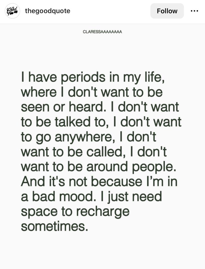 If I’m self-isolating, it’s so I can preserve the limited energy I do have so I can get through the shit I have to get through without falling apart and losing everything I’ve been busting my ass over the past four years to gain.