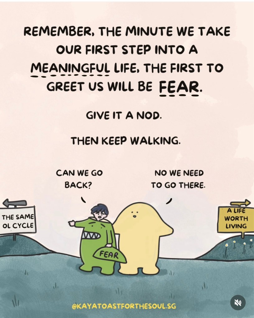 Yes, like the cartoon blob is saying, it’s definitely a “we” thing; there really is no journey on which a person walks alone. Fear, I’ve found, is a constant companion on any path through life, and it’s helpful to paint him as a regular guy in a cuddly green costume who just needs a little guidance to get on the right track. He can get super annoying and occasionally hold you back, but he’s not actually an evil spirit you need to exorcise.